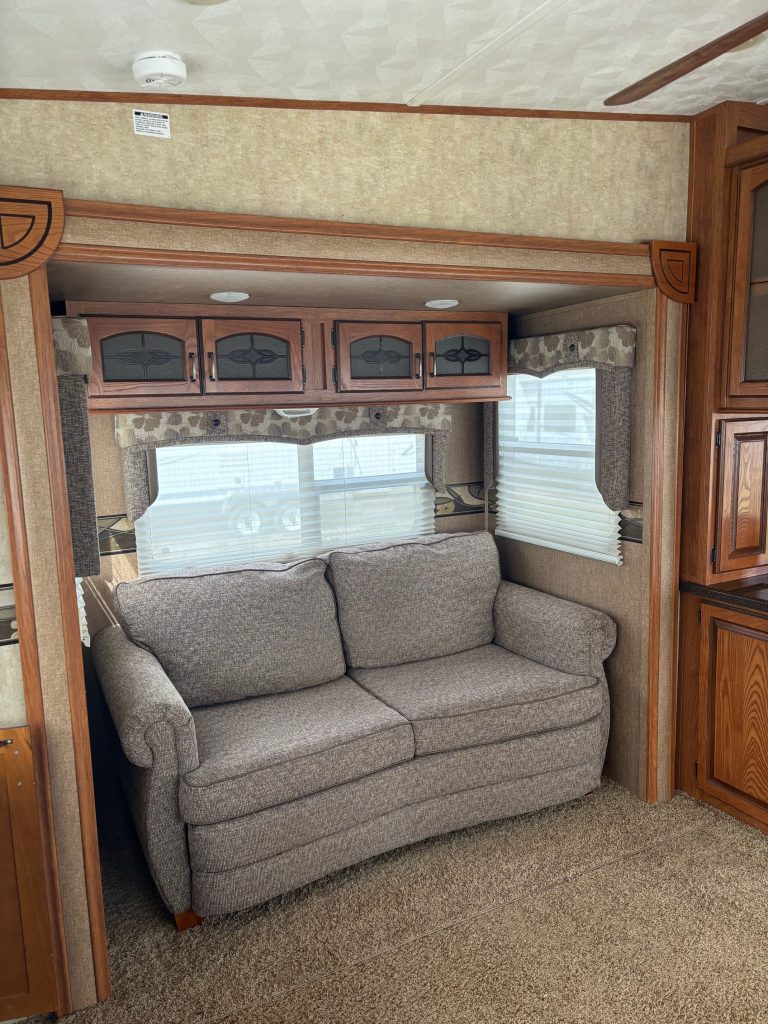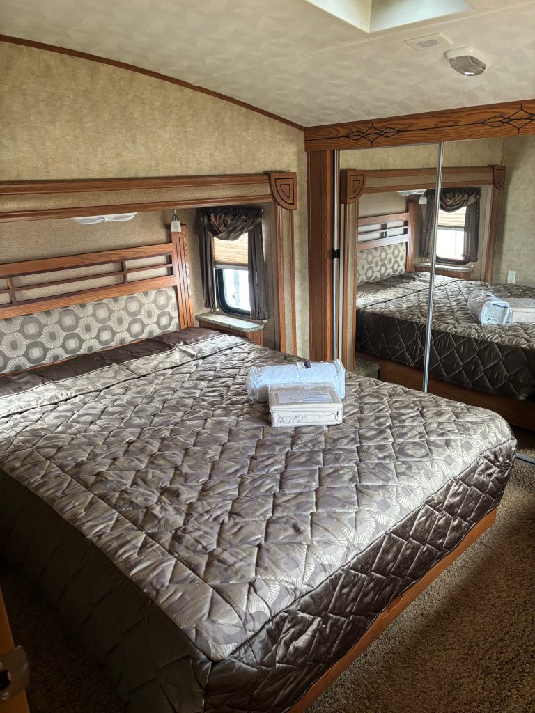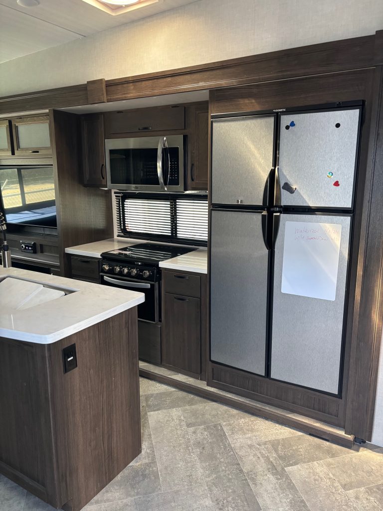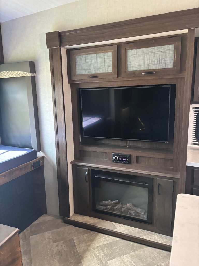This immaculate fifth wheel features four expansive slide-outs, including dual slides in the living area for an open, inviting feel. The kitchen offers generous counter space and abundant storageβ€”perfect for cooking on the road. Enjoy a roomy master bedroom with ample closet space, providing a true home-away-from-home experience. Ideal for extended stays or full-time living!