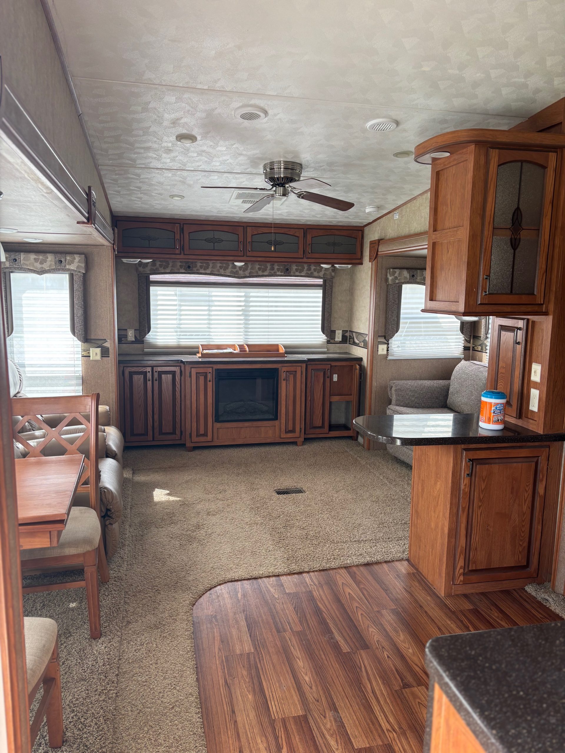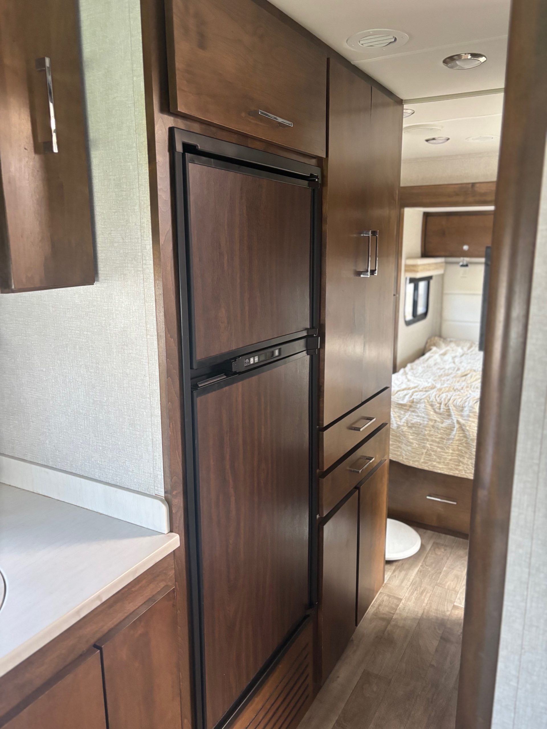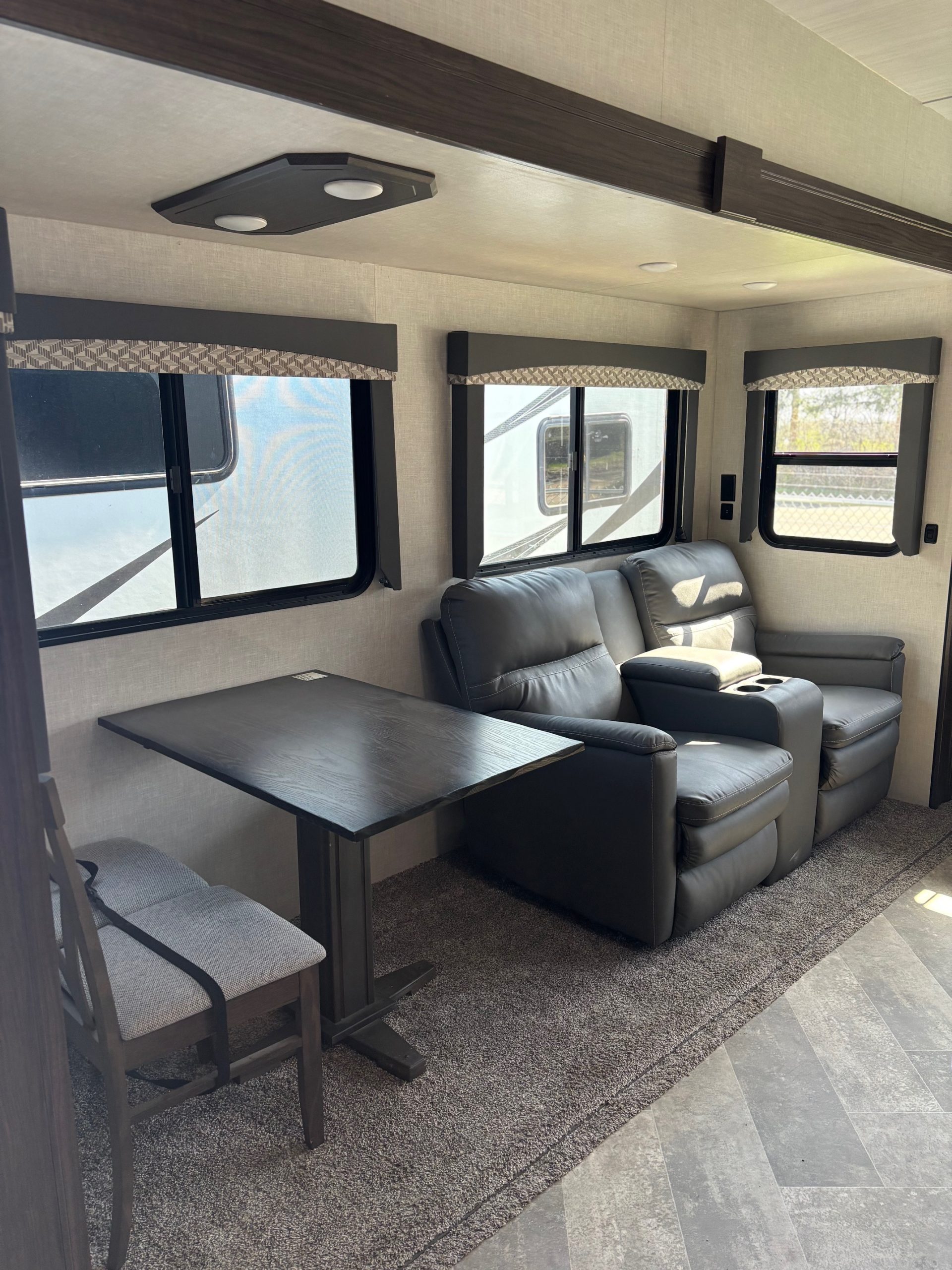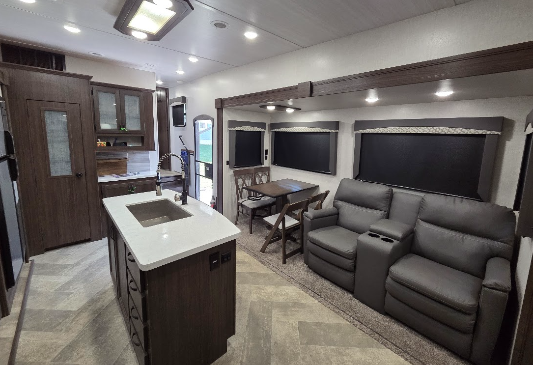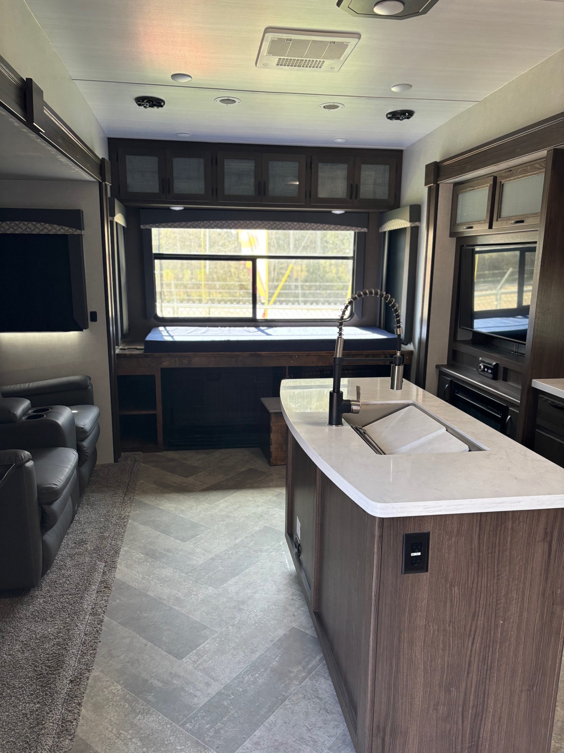 This immaculate fifth wheel features four expansive slide-outs, including dual slides in the living area for an open, inviting feel. The kitchen offers generous counter space and abundant storageβ€”perfect for cooking on the road. Enjoy a roomy master bedroom with ample closet space, providing a true home-away-from-home experience. Ideal for extended stays or full-time living!