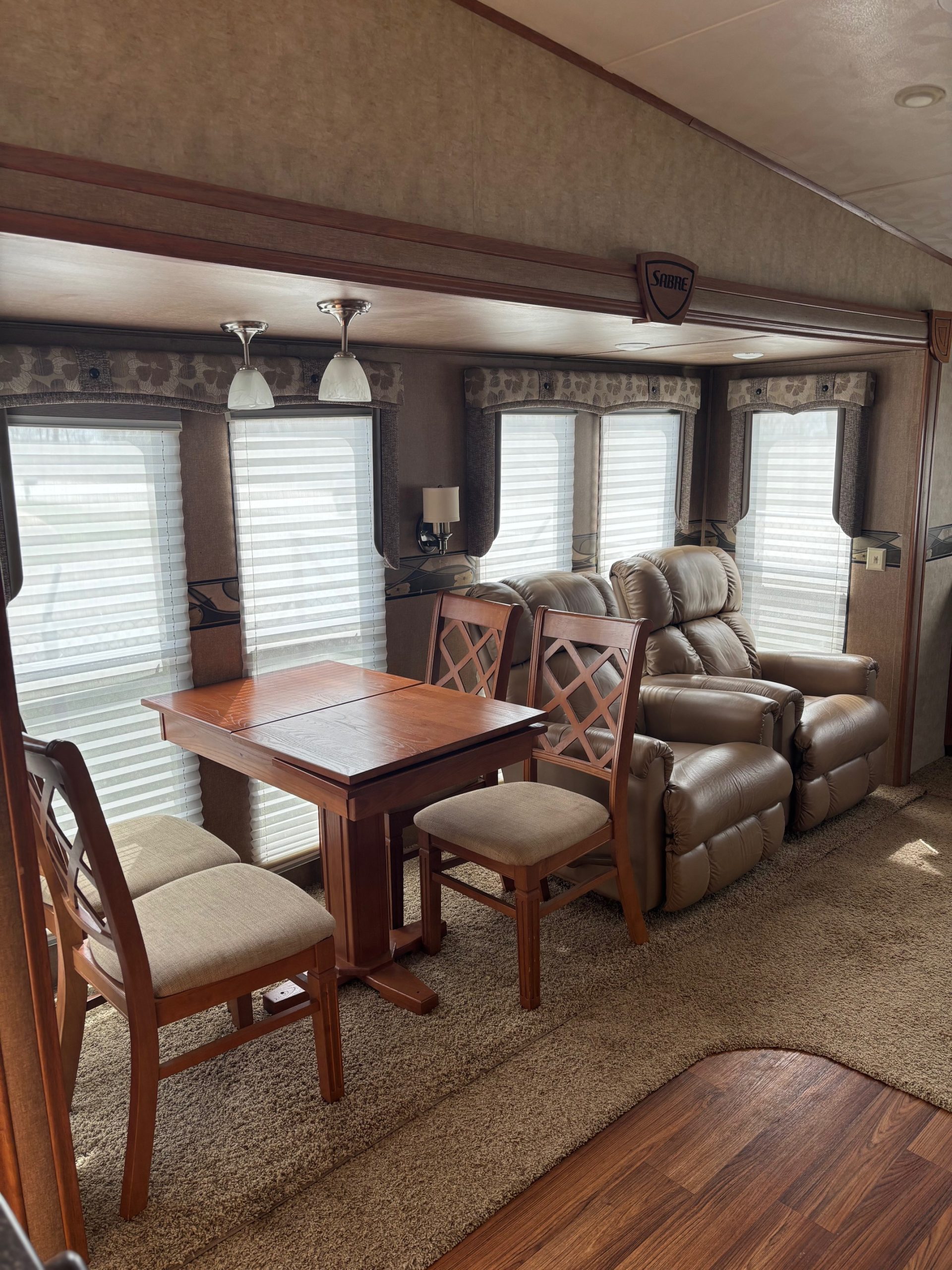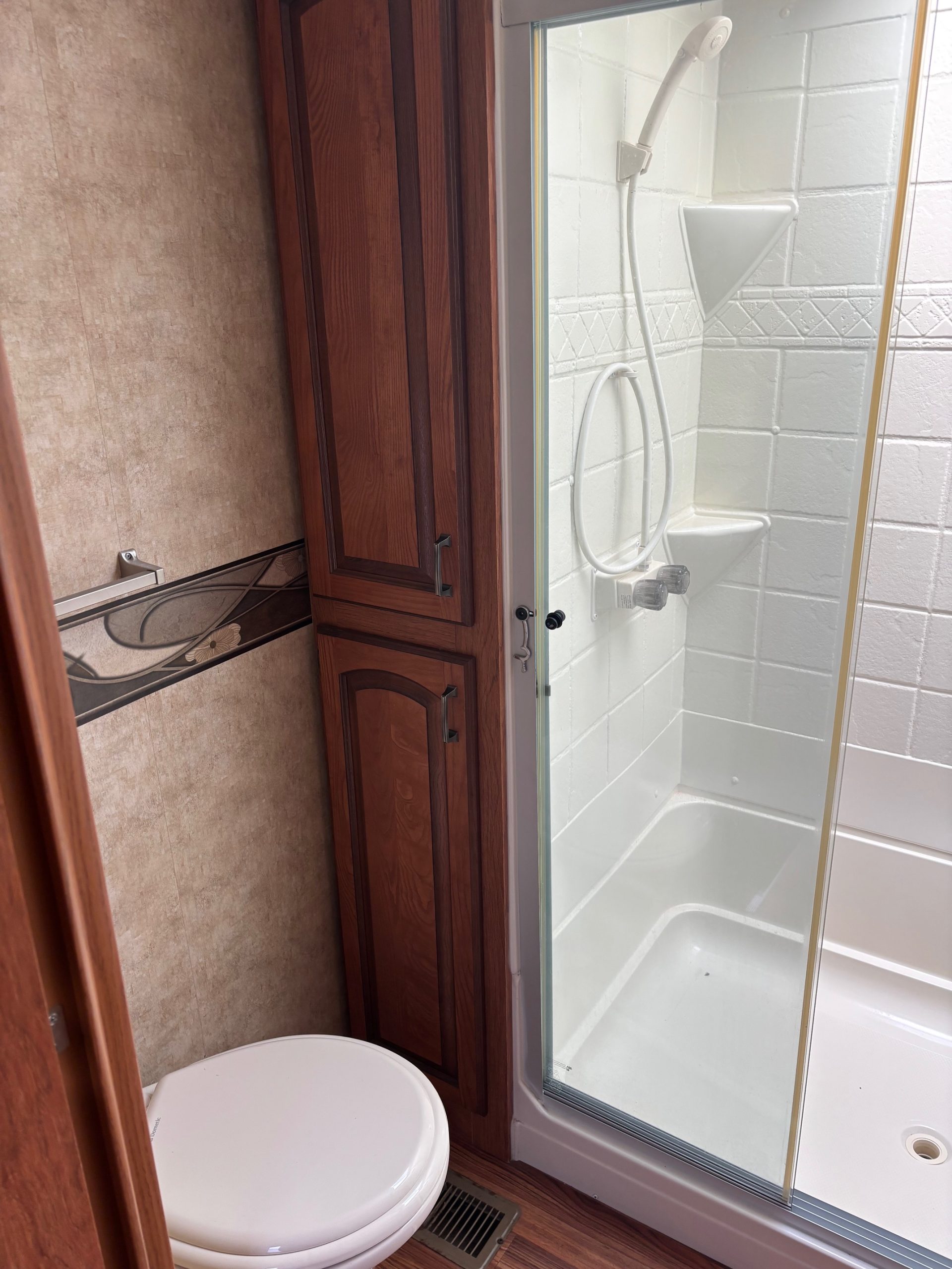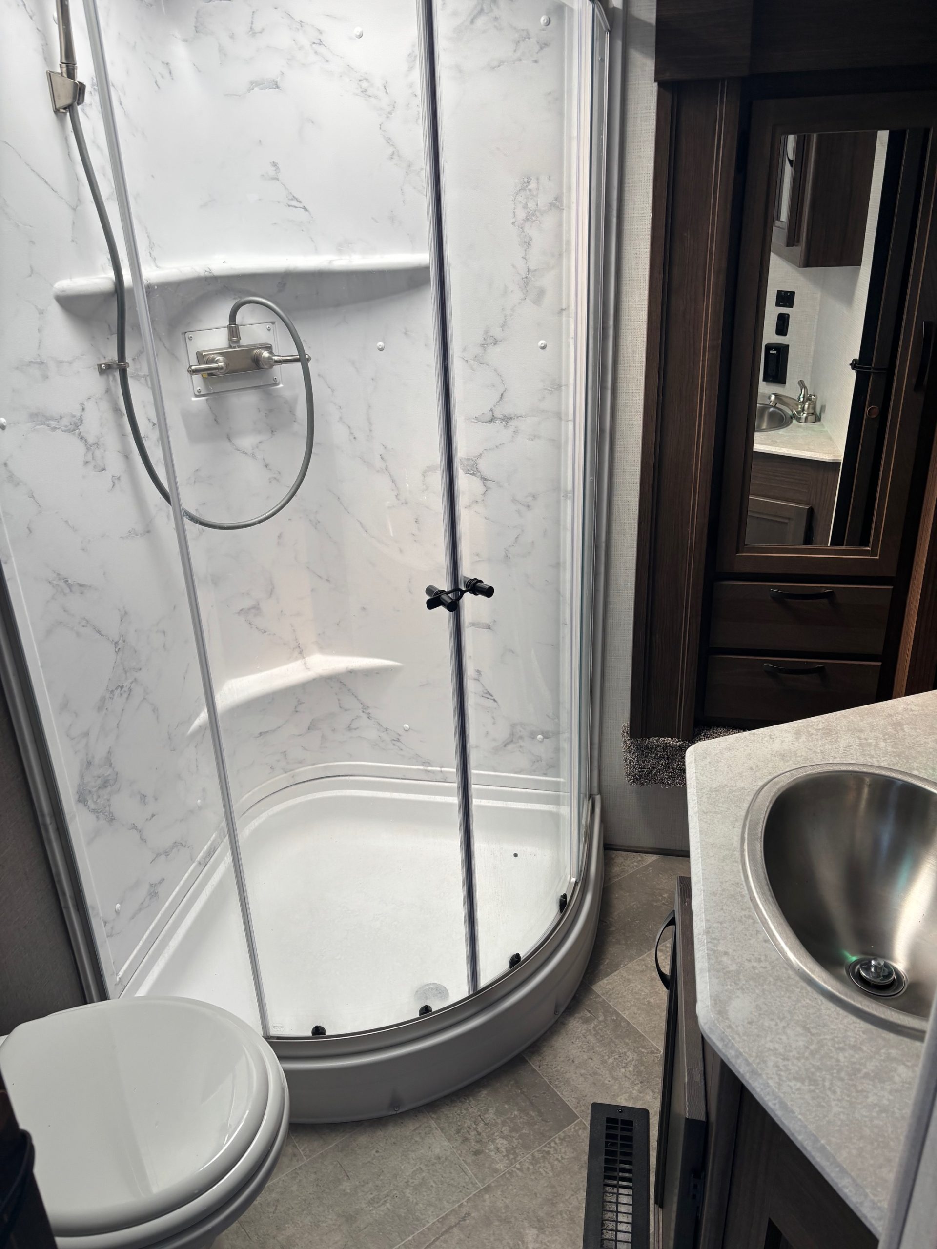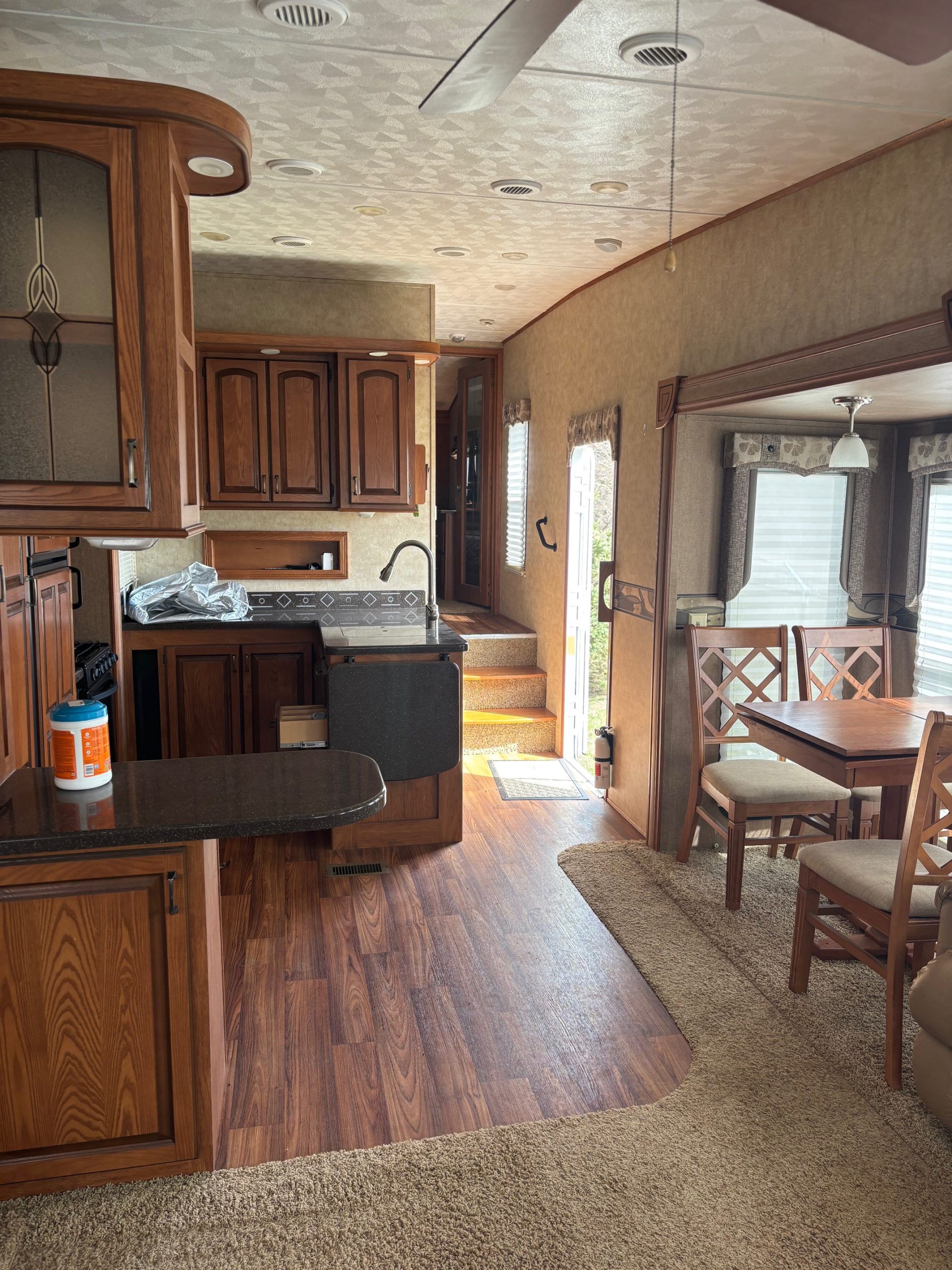 This immaculate fifth wheel features four expansive slide-outs, including dual slides in the living area for an open, inviting feel. The kitchen offers generous counter space and abundant storageβ€”perfect for cooking on the road. Enjoy a roomy master bedroom with ample closet space, providing a true home-away-from-home experience. Ideal for extended stays or full-time living!